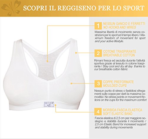 ✓ LIBERTA’ DI MOVIMENTO: Assenza di ferretto, schiena a vogatore e spalline ergonomi per la massima libertà di movimento. Ideale per chi cerca un reggiseno sportivo comodo e versatile, adatto a qualsiasi attività: fitness, corsa, palestra, yoga e tempo libero;