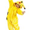 Costume di carnevale di Pikachu Pokemon per bambino. Il costume consiste in una tuta intera con bottoni sul petto e cappuccio con volto di Pikachu. Non sono presenti ulteriori accessori.