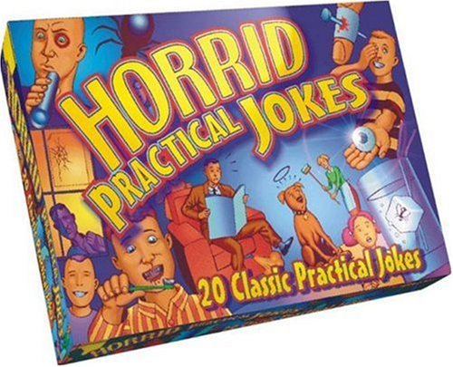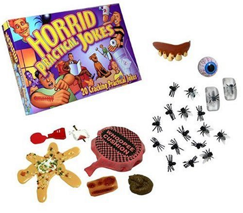 Contains 10 jokes such as nail through finger whoopee cushion dog poo and vomit with instructions to play a further 10 tricks