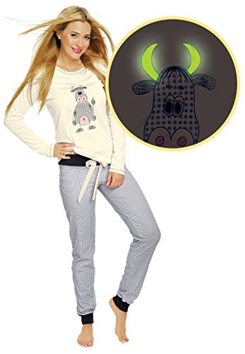 Felpa del pigiama con fantasie divertenti. Corna di mucca e bagliore nel buio! Pantaloni di piccolo plaid, cintura e elastico con colore uniforme.