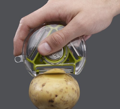 Sbucciatore dal deisgn compatto, che incorpora 3 diverse lame in un unico oggetto. Le lame sono fatte in acciaio inox e sono perfettamente affilate. Una volta selezionata la lama desiderata (standard, seghettata o julienne), basta ruotare il bottone metallico posto al centro dello sbucciatore fino ad arrivare alla lama prescelta. E’ dotato anche di un piccolo gancio di metallo per rimuovere i fiori delle patate. Può essere aperto per essere pulito più facilmente. Lavabile in lavastoviglie.