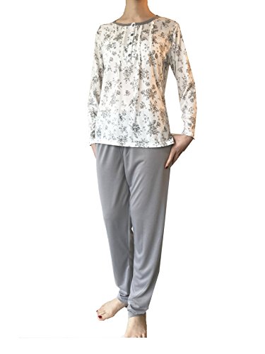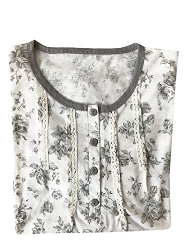 FEMMINILE E RAFFINATO: Completo a due pezzi con maglia in morbido tessuto di 100% Cotone con motivo floreale e pantalone in tinta unita. Scollo serafino con eleganti inserti in pizzo. Perfetto per chi cerca un pigiama comodo e pratico che esalta femminilità ed eleganza.
