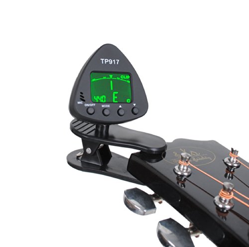 Accordatore digitale con dispositivo clip-on in gomma antiscivolo; Suono percepito tramite vibrazioni o microfono integrato; Accordatura precisa tramite simulazione di un ago o 3 LED a 440 Hz; Display LCD retroilluminato; Batteria a bottone 2025 inclusa;