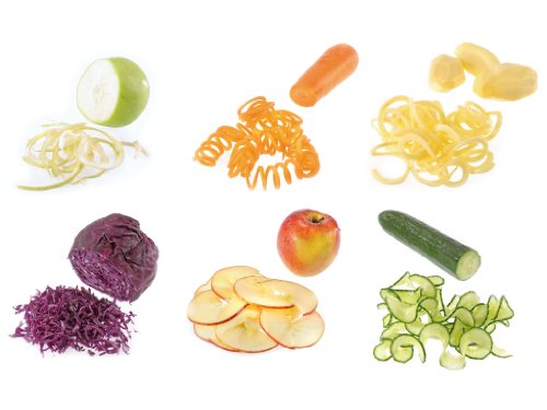 Ideale per la preparazione di carote, mele, cetrioli, patate, croccante insalata di cavolo, ecc. con 3 lame intercambiabili.